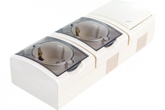 Блок IP54. Розетка двойная с крышкой Schuko 2x2Р+Е 16A + Переключатель 10AX 250В~, сл.кость, S15A