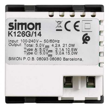 Simon K126G-14 Зарядное устройство USB A+C 21W, 230В
