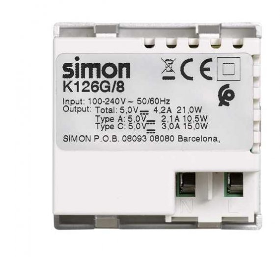 Simon K126G-8 Зарядное устройство USB A+C 21W, 230В