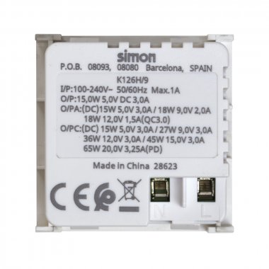 Simon K126H-9 Зарядное устройство USB A+C 65W, 230В